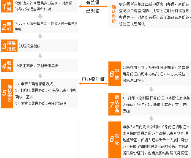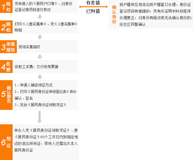 到户籍所在地派出所户籍窗口办理,身份证登记项目有差错的,凭有关证明材料按程序办理更正,对身份有疑点或无法确认身份的,经社区民警确认